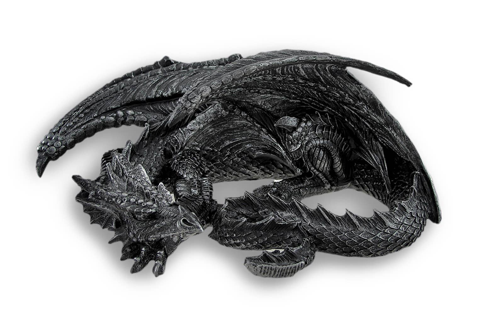 Artistically sculpted from poly-resin, this 11 1/2 inch (29.2 cm) long, 10 inches (25.4 cm) wide, 4 3/4 inch (12 cm) high metallic black dragon statue is expertly hand-painted to reveal all the great detail.